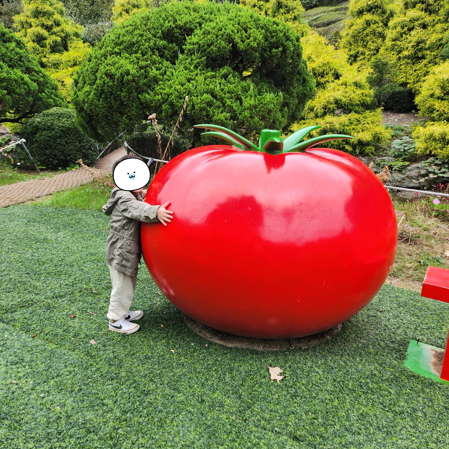 1위는 입구 대형 토마토 조형물입니다. 높이 2m가 넘는 빨간 토마토 모형이 있는데, 아이가 토마토를 껴안는 구도로 찍으면 정말 귀엽습니다. 특히 가을 단풍이 배경이 되면 빨강과 노랑의 대비가 환상적이에요.