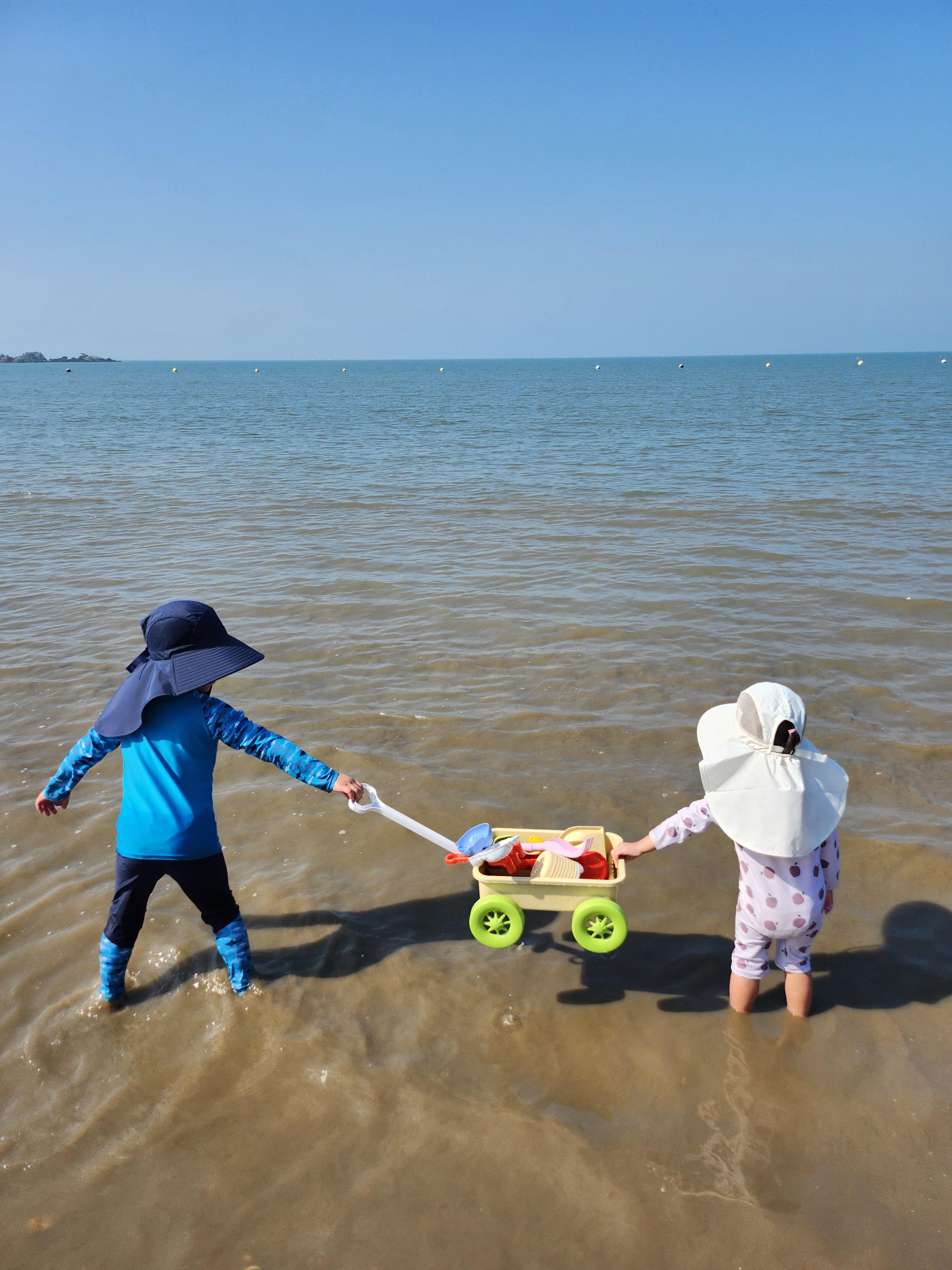 저희는 오전 9시 반경 도착했는데, 썰물이 시작되는 시간이라 처음에는 발목까지 물이 차 있었지만 점차 갯벌이 드러났습니다. 아침 9~10시 도착하면 해수욕과 갯벌체험을 모두 즐길 수 있어요.